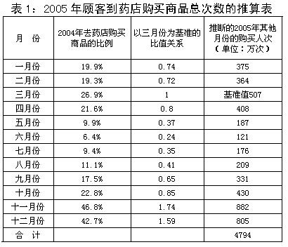 通過對(duì)被抽樣藥店的購買流量觀測(cè)發(fā)現(xiàn),平均每個(gè)藥店在平常日的購買次數(shù)為176次,節(jié)假日為172次,市區(qū)全部936個(gè)藥店在一個(gè)月內(nèi)的購買流量為507萬次。同樣按前文的12個(gè)月被調(diào)查者去藥店的比例比值關(guān)系,可以推算出被調(diào)查者2005年到藥店購買商品的總次數(shù)約為4794萬次(見表1)。