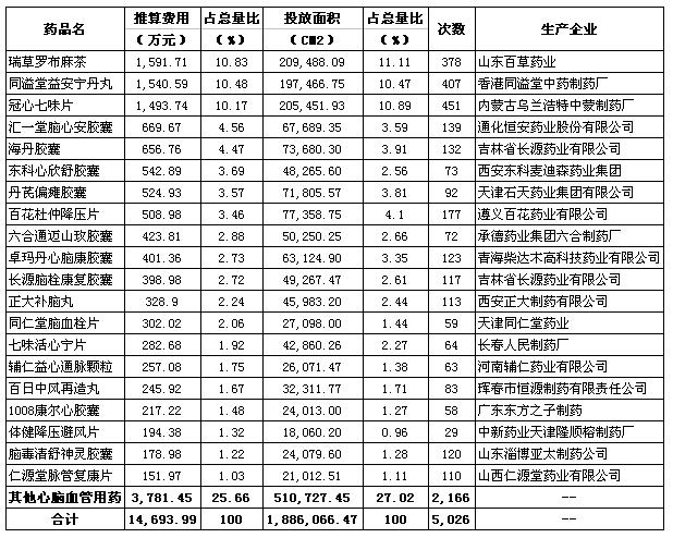 截止到今年5月,在報(bào)刊廣告市場(chǎng)投放的249種心腦血管用藥中,今年推出的新品種共41種,而這些新品種的報(bào)刊廣告投放量現(xiàn)已初顯規(guī)模。如七味活心寧片、六合通邁山玫膠囊、百日中風(fēng)再造丸等在短時(shí)內(nèi)就已擁有了較高的報(bào)刊廣告市場(chǎng)占有率(見(jiàn)表2)。