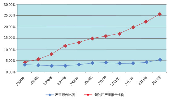 圖3 2004-2014 年新的和嚴重以及嚴重藥品不良反應(yīng)/事件報告比例