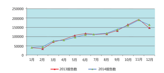 2014年月度病例報告數(shù)量在整體趨勢上與2013年基本相同,報告數(shù)量主要集中在10-12月,其中11月是報告高峰,但月度報告數(shù)量差距逐漸縮小,集中上報現(xiàn)象逐步緩解。