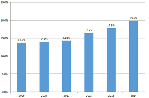 圖9 2009-2014年65歲以上老年患者不良反應(yīng)報告比率