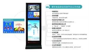 這塊顯示屏是全稱為“餐飲食品安全信息發(fā)布平臺”的終端顯示設備。今年年初,成都市結合餐飲企業(yè)的“明廚亮灶”工程,在全市大中型餐飲企業(yè)和學校食堂推廣設立了“餐飲食品安全信息發(fā)布平臺”。該平臺是一套協(xié)助監(jiān)管部門對餐飲企業(yè)實施在線監(jiān)管、食品安全信息公示、信息發(fā)布的線上、線下相結合的多媒體互動平臺。