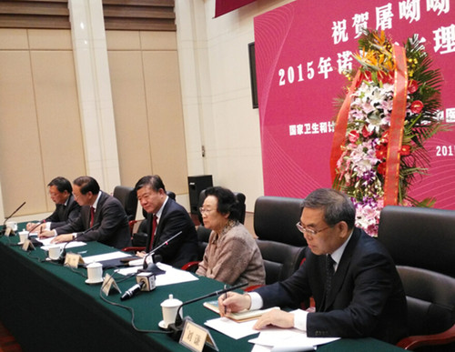 當(dāng)日,國(guó)家衛(wèi)生和計(jì)劃生育委員會(huì)、國(guó)家中醫(yī)藥管理局、國(guó)家食品藥品監(jiān)督管理總局共同舉辦座談會(huì),祝賀屠呦呦研究員榮獲2015年諾貝爾生理學(xué)或醫(yī)學(xué)獎(jiǎng)。