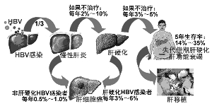 乙肝病毒感染是導致肝硬化和肝癌的重要原因。如果沒有規(guī)范的治療,慢性乙型肝炎患者發(fā)展為肝硬化的幾率大約為每年2%~10%,5年累積肝硬化發(fā)生率大約12%~25%;代償期肝硬化患者如果不治療,每年有3%~5%的患者進展為失代償期肝硬化或肝功能衰竭;失代償期肝硬化或肝衰竭的患者5年生存率僅為14%~35%,有65%~86%的患者死亡,或需要做肝移植手術(見附圖)。