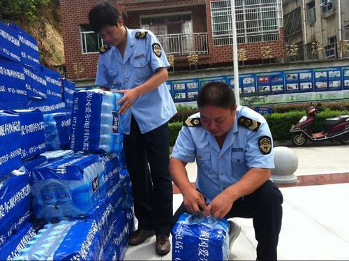 圖為英山縣局執(zhí)法人員對捐贈的飲用水進行檢查。(黃娟 攝)