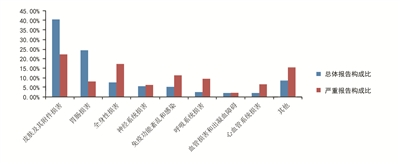 2016年抗感染藥物不良反應(yīng)/事件報(bào)告中,與抗感染藥的整體報(bào)告相比,嚴(yán)重報(bào)告的全身性損害、免疫功能紊亂和感染及呼吸系統(tǒng)損害的構(gòu)成比明顯升高(如圖所示)。