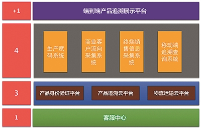 “1”是指建立1個客服中心,對外向商業(yè)客戶、消費者提供產(chǎn)品質(zhì)量、用法、真?zhèn)涡畔⒉樵兒头答?,要為客服中心開放必要的追溯系統(tǒng)查詢權(quán)限。“3”是指3個平臺:第一個平臺是指存放追溯系統(tǒng)相關(guān)服務器、存儲資源的云平臺,定位在IaaS層面;第二個平臺是指多個企業(yè)、多條生產(chǎn)線共用的產(chǎn)品身份驗證平臺,定位在SaaS層面;第三個平臺是指物流運輸云平臺,定位在SaaS層面?!?”是指要為上述4個關(guān)鍵節(jié)點,按照追溯的設(shè)計原理,建立對應的應用系統(tǒng),包括生產(chǎn)賦碼系統(tǒng)、商業(yè)客戶流向采集系統(tǒng)、銷售終端信息采集系統(tǒng)、移動端追溯查詢系統(tǒng)?!?1”是指將整個產(chǎn)品追溯系統(tǒng)中涉及的原料輔料包材供應商、生產(chǎn)班次、產(chǎn)品規(guī)格、產(chǎn)品追溯碼、包裝追溯碼、商業(yè)產(chǎn)品流向等各類信息,通過一個集成的平臺進行匯集、展示和分析(在此我們命名為“端到端產(chǎn)品追溯展示平臺”),在出現(xiàn)產(chǎn)品質(zhì)量問題時,在這個平臺上通過輸入“產(chǎn)品追溯碼”或“包裝追溯碼”,就能以鏈條的方式對產(chǎn)品進行銷售時間、銷售終端、商業(yè)客戶出入庫時間、物流承運商、生產(chǎn)批號、原料輔料包材供應商等信息進行端到端的可視化追溯。