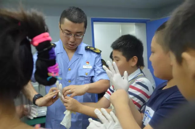 工作人員首先分發(fā)給孩子們做快檢用的一次性手套。哇哦,看我們的姜所長(zhǎng)一臉慈愛地教孩子們?cè)趺创魇痔?,再戴上口罩,全幅武裝好啦~