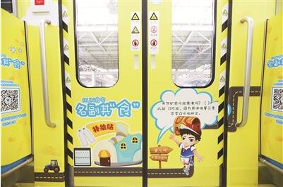 筆者走進(jìn)“大千食界”車廂,發(fā)現(xiàn)車廂內(nèi)壁和車門上的卡通漫畫很有趣。車門上的漫畫通過一個小男孩和小天使、小惡魔的對話,就科普了一則食安知識:“剩余的涼菜要存放在冰箱中冷藏或冷凍,再次食用前必須經(jīng)過充分加熱,并確認(rèn)是否變質(zhì)”。筆者留意到,一位中年女性一直在仔細(xì)觀看車廂里的漫畫?!斑@種形式真不錯。有了這些漫畫,坐地鐵就不無聊了,而且看著這些漫畫還能學(xué)到不少有用的食品安全知識。我現(xiàn)在成了這些車廂的粉絲,每天上下班都想‘邂逅’這列地鐵。”她笑著說,“周末我還想帶著孩子一起來看看。”