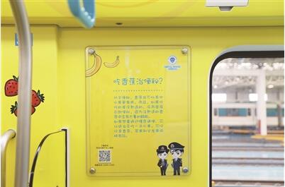 “剛才一走進(jìn)車廂我就眼前一亮,感覺像進(jìn)了動漫館一樣,很炫很有趣?!眮碜员本┑某丝颓炓贿吤χ诘罔F3號線的車廂里拍照片,一邊說,“仔細(xì)一看,這些漫畫和卡通形象都是在宣傳食品安全方面的科普知識。因為工作的原因,國內(nèi)的地鐵我?guī)缀醵甲^了,這樣的車廂我還是第一次看到,非常有創(chuàng)意。我剛才在朋友圈里一轉(zhuǎn)發(fā),立刻就引發(fā)了很多秒贊。”