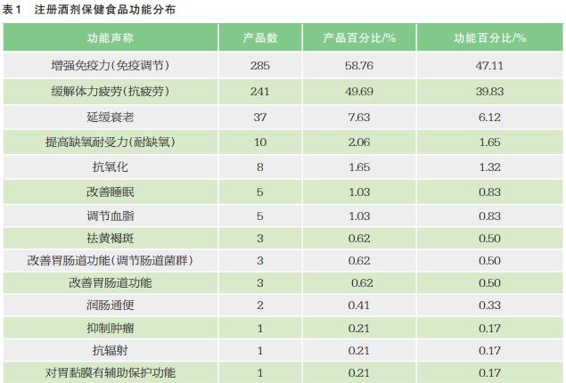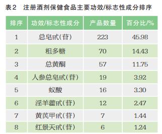 自1996年保健食品實(shí)行注冊(cè)制度以來(lái),截至2015年,共批準(zhǔn)注冊(cè)酒劑保健食品485個(gè),占同期注冊(cè)產(chǎn)品總量的3.08%,多數(shù)為原衛(wèi)生部批準(zhǔn)的注冊(cè)產(chǎn)品。由于酒劑保健食品部分產(chǎn)品聲稱具有2個(gè)及以上的功能,使功能頻次總和(605次)大于注冊(cè)產(chǎn)品總量(485個(gè))。酒劑保健食品功能聲稱主要集中在增強(qiáng)免疫力(免疫調(diào)節(jié))及緩解體力疲勞(抗疲勞)兩方面,所占比例超過(guò) 80%(見表1)。注冊(cè)酒劑保健食品功效/標(biāo)志性成分主要為總皂苷、粗多糖及總黃酮(見表2)。