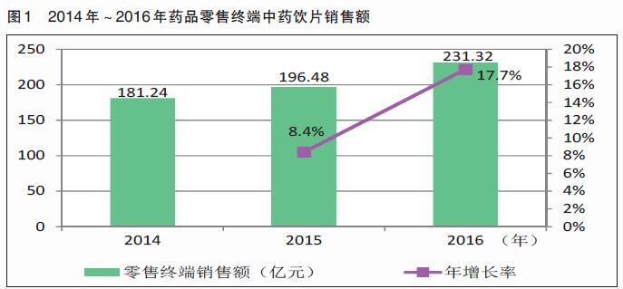 據(jù)統(tǒng)計(jì),2016年中藥飲片零售終端市場的銷售額為231.32億元,同比增長17.7%(見圖1)。其增長速度超過了同年度零售終端西藥、中成藥將近十個(gè)百分點(diǎn),是零售藥店銷售額增長最快的品類。《報(bào)告》認(rèn)為,中藥飲片在零售市場表現(xiàn)優(yōu)異,主要得益于國家政策助力中醫(yī)藥的發(fā)展,而消費(fèi)者養(yǎng)生調(diào)理保健需求的日益提升,也使得中藥飲片在藥品零售市場實(shí)現(xiàn)了價(jià)值回歸。