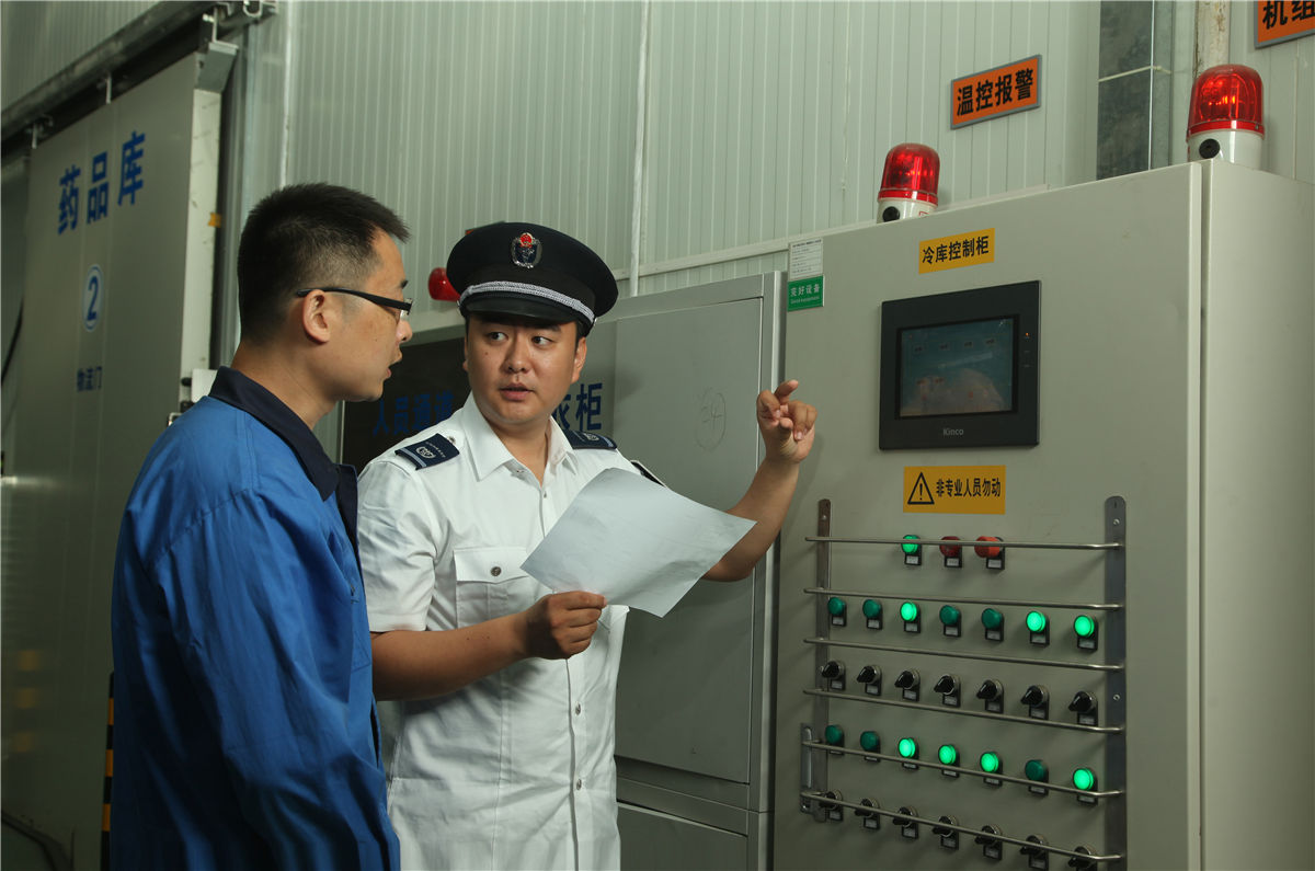圖為天津市河北區(qū)市場(chǎng)和質(zhì)量監(jiān)督管理局藥化科科長(zhǎng)譚浩在藥品冷鏈倉(cāng)庫(kù)檢查控制室溫濕度操作儀器,確保夏季冷鏈藥品質(zhì)量安全。