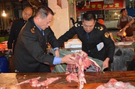 圖為婁底市局聯(lián)合市公安局、市檢察院查處涉嫌違法的豬肉銷(xiāo)售攤點(diǎn)