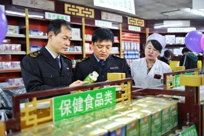 圖為寧夏區(qū)局的執(zhí)法人員在某藥店對保健食品進(jìn)行檢查。