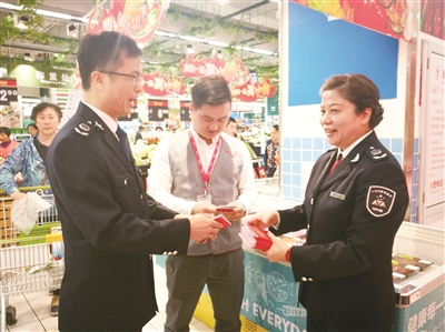 圖為近日深圳市局相關(guān)負(fù)責(zé)人在向食品經(jīng)營者贈送小冊子/攝影報(bào)道 陳海榮 鄒凡