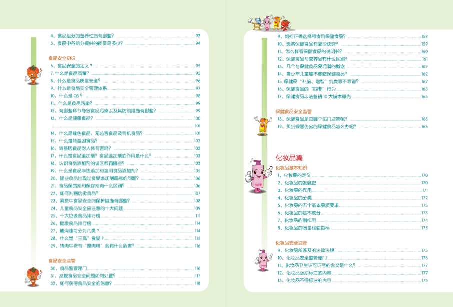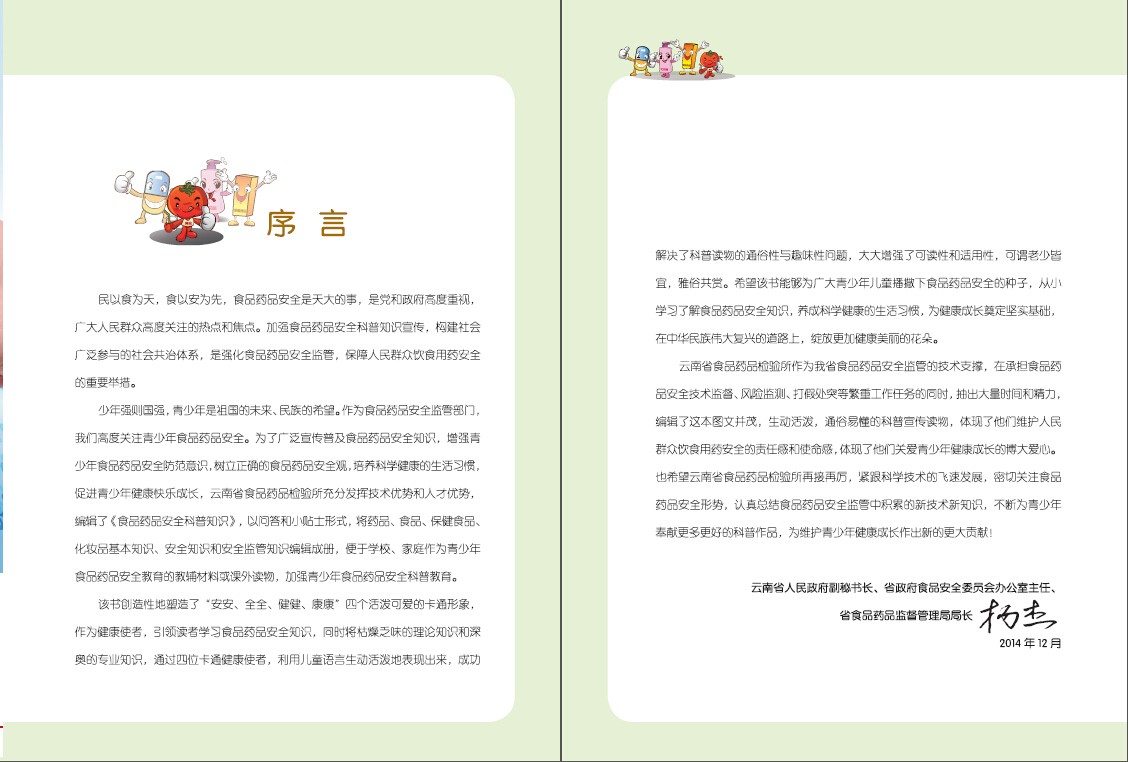 該書共15萬字,分藥品、食品、保健食品、化妝品4篇,含食品、藥品、保健品、化妝品的基本知識、安全知識、安全監(jiān)管、安全使用常識4方面240個問題。該書創(chuàng)造性地設計了“安安、全全、健健、康康”4個卡通健康使者,用通俗語言和兒童語言表述專業(yè)性很強的食品藥品安全知識,解決了科普知識專業(yè)性與可讀性難以兼顧的難題,增強了趣味性,提升了閱讀感受,拓展了適宜閱讀人群,成為老少皆宜的科普圖書,深受讀者喜愛。該作品得到了云南省人民政府食品安全委員會辦公室、省食品藥品監(jiān)督管理局的高度關注,時任云南省人民政府副秘書長、省政府食品安全委員會辦公室主任、省食品藥品監(jiān)督管理局局長楊杰為該書作序。