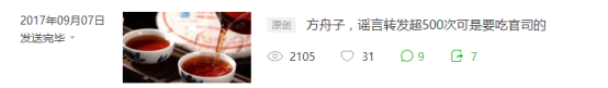 2017年9月,方舟子發(fā)表了一篇名為《喝茶能防癌還是致癌?》的微信文章,稱:普洱茶含強(qiáng)致癌物黃曲霉毒素,引起業(yè)界與消費(fèi)者的熱議。