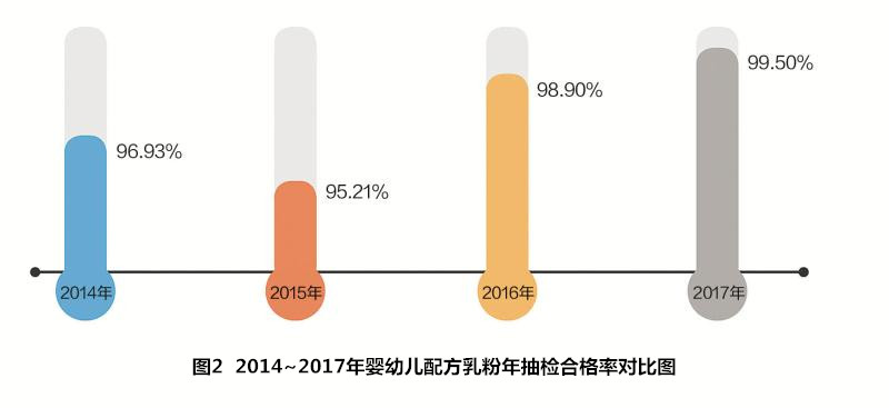 新政在防范嬰幼兒配方乳粉質量安全風險、從源頭提升嬰幼兒配方乳粉質量安全總體水平上同樣發(fā)揮了積極的促進作用。為進一步加強嬰幼兒配方乳粉質量監(jiān)管,從2016年1月開始,國家食藥監(jiān)總局對嬰幼兒配方乳粉實行“月月抽檢、月月公開”。據國家食藥監(jiān)總局官網發(fā)布的嬰幼兒配方乳粉國家專項監(jiān)督抽查結果,其全年抽檢合格率由2014年的96.93%上升至2016年的98.90%,到2017年,嬰幼兒配方乳粉樣品全年抽查不合格樣品僅有5批次,抽檢合格率達99.50%(詳見圖2),嬰幼兒配方乳粉質量總體進一步提升。