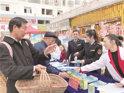 3月30日,貴州省銅仁市石阡縣市場(chǎng)監(jiān)管局工作人員在該縣西門廣場(chǎng)向群眾發(fā)放食品藥品安全知識(shí)宣傳材料。 本報(bào)記者 蒙水 通訊員 馬竹圍 攝影報(bào)道