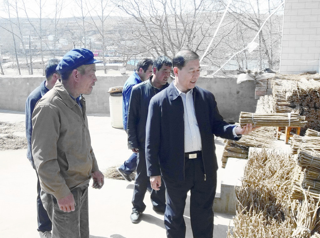圖為甘肅省食藥監(jiān)局局長(zhǎng)李存文(前排右一)在貧困戶家中了解中藥材收成情況/攝影 韓仁輝