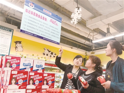 圖為4月25日酒泉市北京華聯(lián)超市的工作人員正在向消費(fèi)者仔細(xì)講解“臨近保質(zhì)期食品銷售專區(qū)”內(nèi)食品挑選、購買知識/攝影 王依依