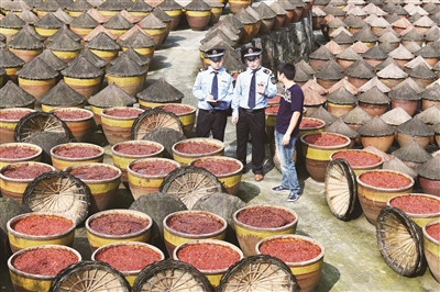 圖為重慶市食品藥品監(jiān)管局九龍坡區(qū)分局執(zhí)法人員檢查火鍋原料企業(yè)