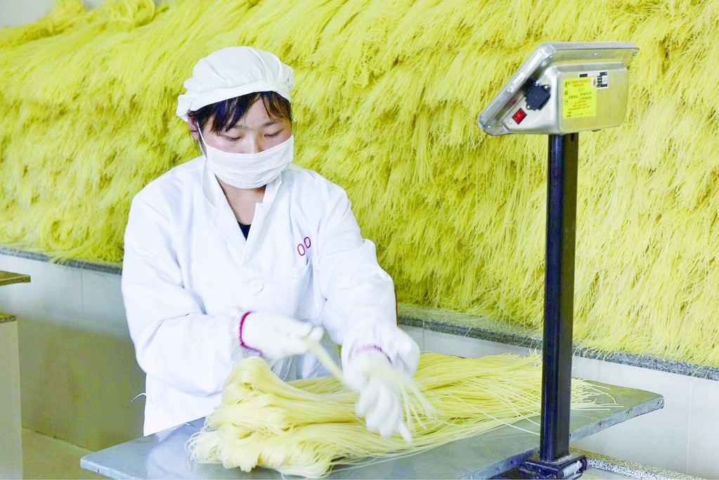 圖為張家界市“放心早餐產(chǎn)業(yè)園”內(nèi)米粉生產(chǎn)企業(yè)員工正在為米粉稱重。