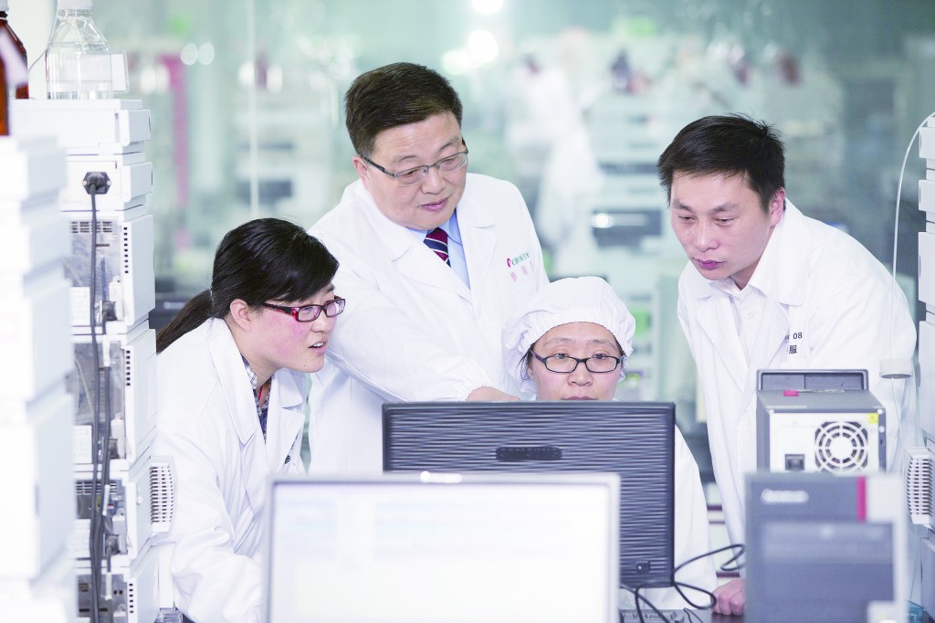 圖為康緣藥業(yè)董事長肖偉(左二)與實(shí)驗(yàn)室科技人員一起探討科研問題。 康緣藥業(yè)供圖