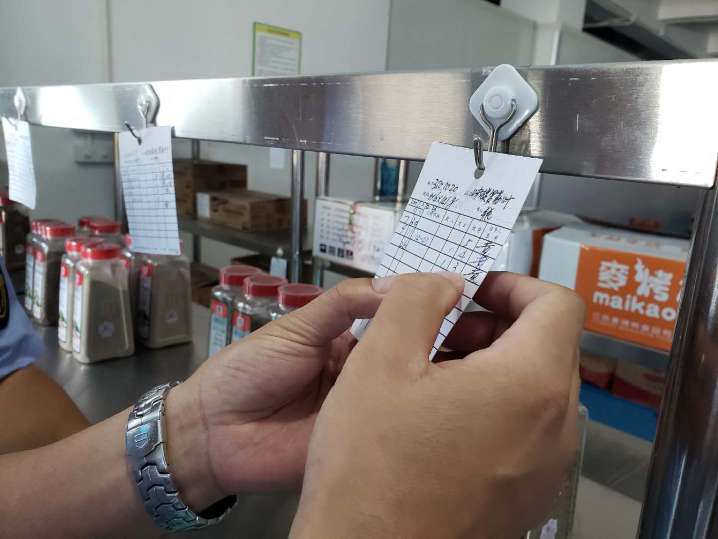 在該企業(yè),執(zhí)法人員率先走進(jìn)5號冷藏庫,庫中每一份原材料與調(diào)味料均配備一張相對應(yīng)的記錄卡,顯示食材的進(jìn)庫、出庫與采購情況。