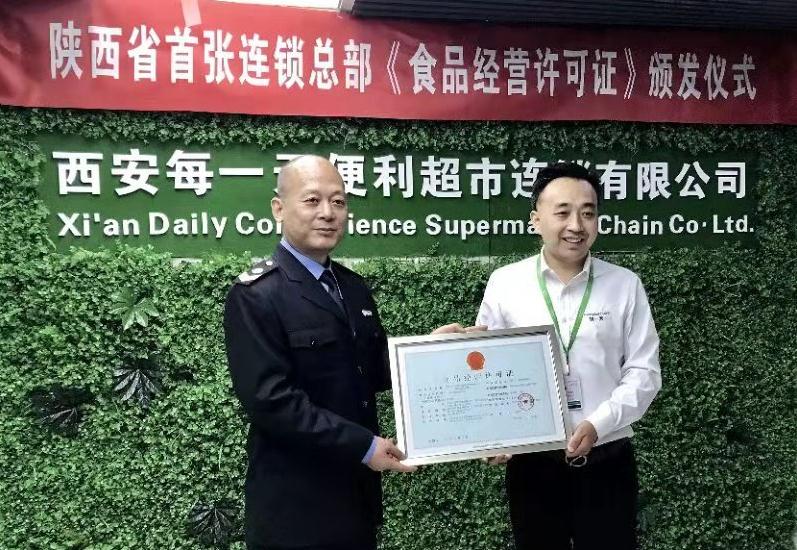 每一天便利超市連鎖有限公司董事長(zhǎng)張培彥從陜西省食藥監(jiān)局副局長(zhǎng)任彥保手中接過連鎖總部《食品經(jīng)營(yíng)許可證》。