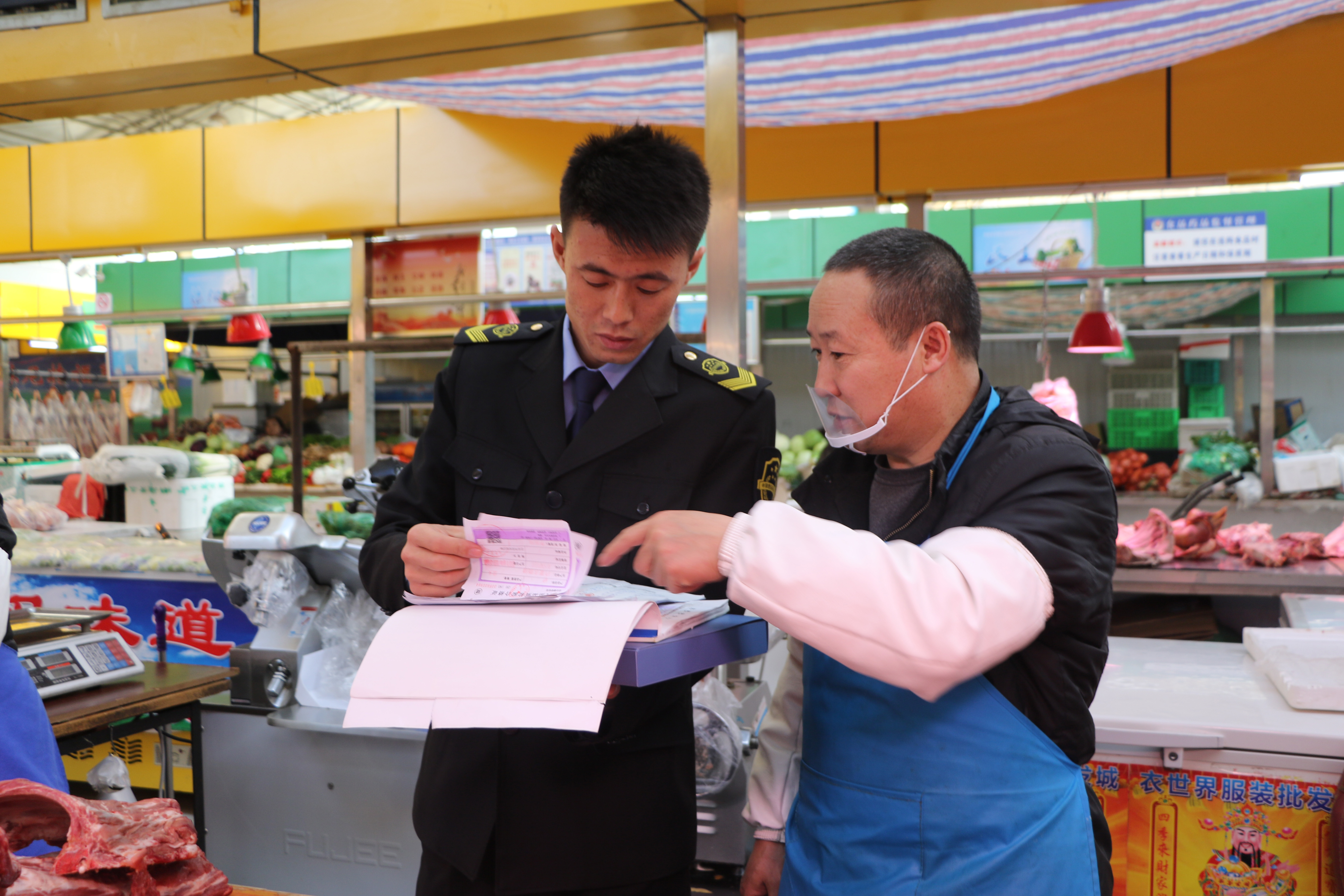 執(zhí)法人員在寶鼎菜市場(chǎng)檢查銷售票據(jù)