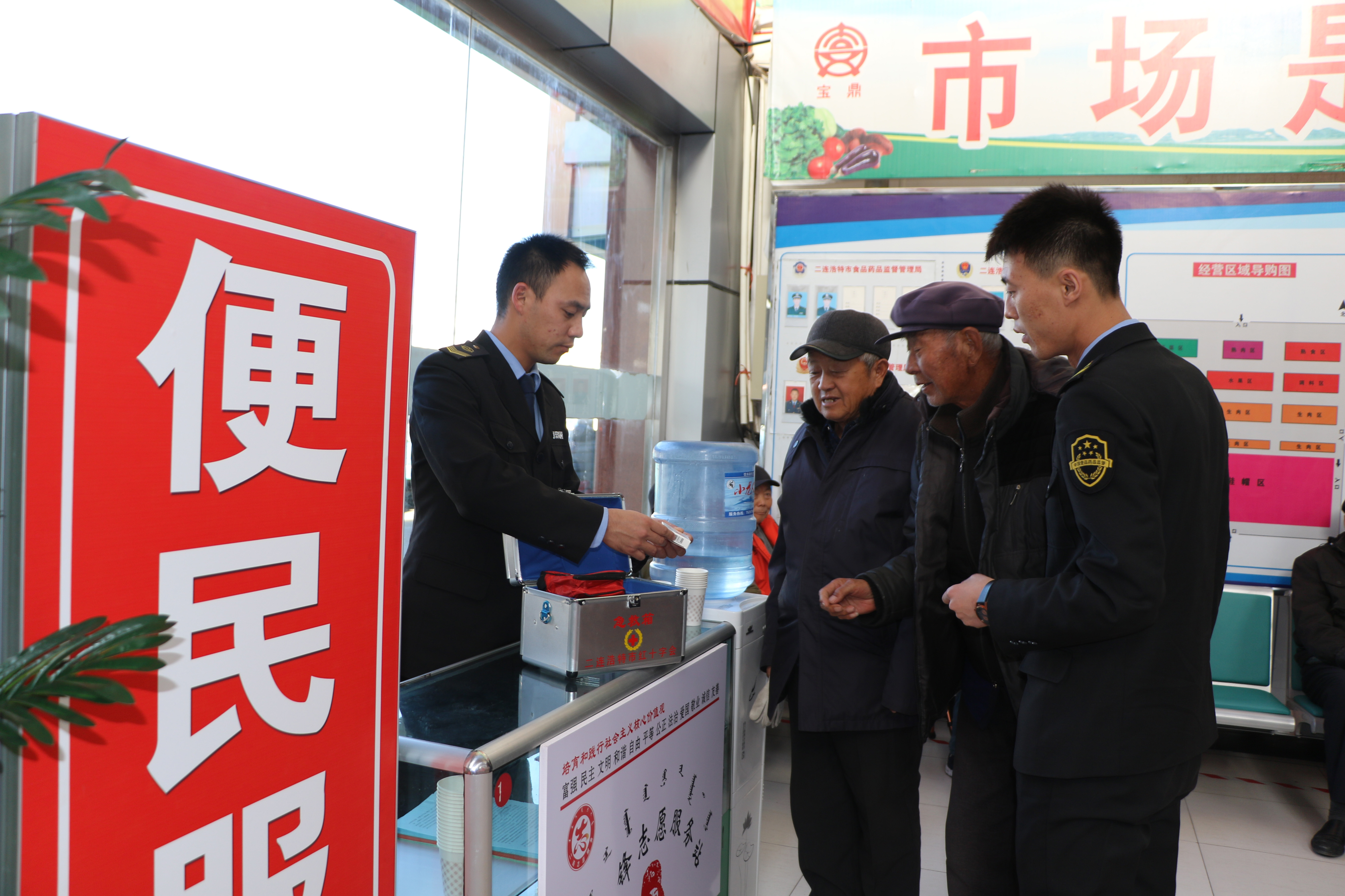 執(zhí)法人員在寶鼎菜市場(chǎng)設(shè)立市場(chǎng)便民服務(wù)點(diǎn)