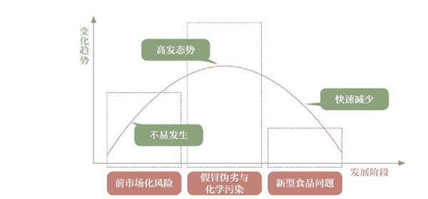 注:圖中實曲線代表不同發(fā)展階段食品安全問題總量變化趨勢,虛線方框代表對應(yīng)的主要食品安全問題類型(資料來源:作者整理)