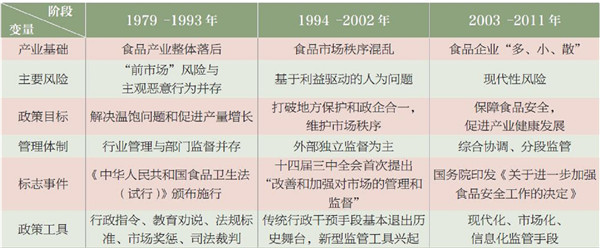 回顧2011 年以前中國食品安全監(jiān)管歷程,我們發(fā)現(xiàn)其理念和實踐變遷符合歷史制度邏輯。改革開放初期,國民經(jīng)濟(jì)百廢待興,解決群眾溫飽問題是食品領(lǐng)域主要矛盾。加之當(dāng)時食品衛(wèi)生問題主要表現(xiàn)為生產(chǎn)力落后導(dǎo)致的“前市場”風(fēng)險,調(diào)動行業(yè)管理部門和地方政府壯大食品產(chǎn)業(yè)的積極性成為理性選擇。因此,不論是法律法規(guī)、監(jiān)管體制抑或政策手段,都帶有鮮明的混合過渡色彩,兼具計劃體制和商品經(jīng)濟(jì)兩類特征。之后,中國食品行業(yè)無序發(fā)展,市場秩序混亂,體制弊端逐漸暴露。在社會主義市場經(jīng)濟(jì)的宏觀背景下,二次改革勢在必行。國家試圖通過全面外部監(jiān)督管理打擊地方保護(hù)和部門局部利益,將食品衛(wèi)生管理帶入法制化軌道,并提出食品安全新理念以符合全產(chǎn)業(yè)鏈條發(fā)展需求。此時,盡管經(jīng)濟(jì)發(fā)展依然是“最大的政治”,但食品安全和衛(wèi)生問題顯然已經(jīng)受到政府更多關(guān)注。