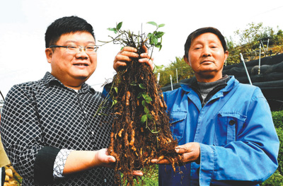 近日,浙江省杭州市余杭區(qū)三葉青中藥材現(xiàn)代農(nóng)業(yè)園區(qū)員工在展示剛剛采摘的傳統(tǒng)中藥材三葉青。龍巍攝