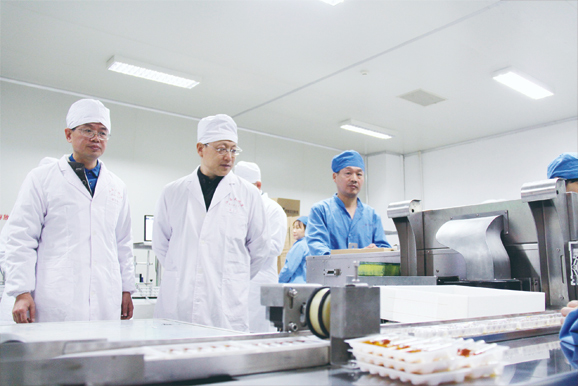 圖為趙子忠(左二)一行在天施康余江分公司察看藥品生產(chǎn)情況。本報記者 譚彩丹 通訊員 王超 攝影報道