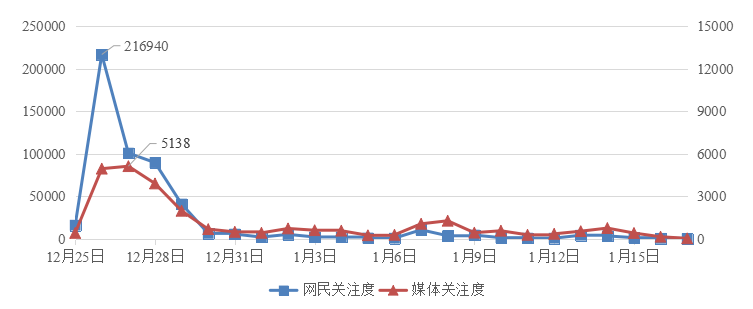 從輿情走勢(shì)來看,以2018年12月25日~2019年1月17日為監(jiān)測(cè)時(shí)間段,如圖1所示,輿情整體呈現(xiàn)“山峰式”特征,網(wǎng)民表現(xiàn)出較高關(guān)注度。微博占比超過九成。