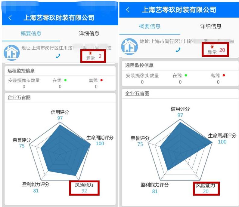 上海藝零玖?xí)r裝有限公司是閔行區(qū)互聯(lián)網(wǎng)誠信聯(lián)盟的成員單位,但其“五官”中風(fēng)險一項的數(shù)據(jù)卻在一個月內(nèi)出現(xiàn)“斷崖式”下跌——從92分的“風(fēng)險極低”掉到了20分的“風(fēng)險極高”。