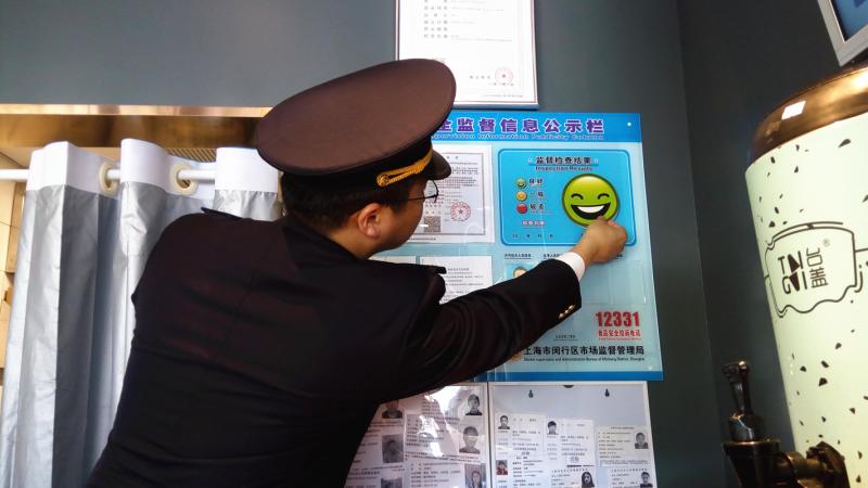 2018年4月8日,閔行區(qū)市場監(jiān)管局工作人員在奶茶鋪獲得食品經(jīng)營許可證后,首次上門查驗,經(jīng)檢查合格,給奶茶鋪貼上“綠色笑臉”。如今,為更方便企業(yè),符合條件的獲證食品經(jīng)營者,監(jiān)管部門上門查驗時,連負(fù)責(zé)人和現(xiàn)場平面圖都不用到現(xiàn)場了。