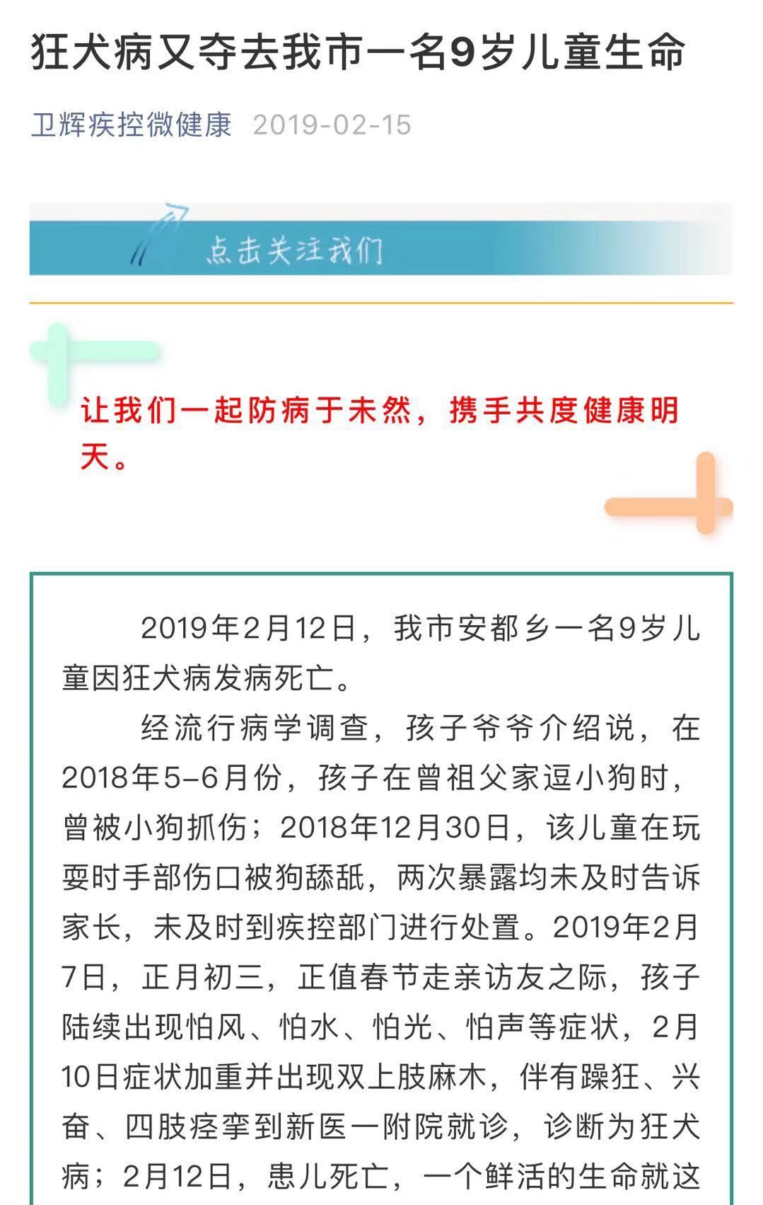 內(nèi)容顯示,在2018年5-6月份,男孩曾被小狗抓傷,2018年12月30日,該兒童在玩耍時手部傷口被狗舔舐,兩次暴露均未及時告訴家長,未及時到疾控部門進(jìn)行處置。2019年2月7日,孩子陸續(xù)出現(xiàn)怕風(fēng)、怕水、怕光、怕聲等癥狀,2月10日癥狀加重并出現(xiàn)雙上肢麻木,伴有躁狂、興奮、四肢痙攣到新醫(yī)一附院就診,診斷為狂犬病,2月12日,患兒死亡。