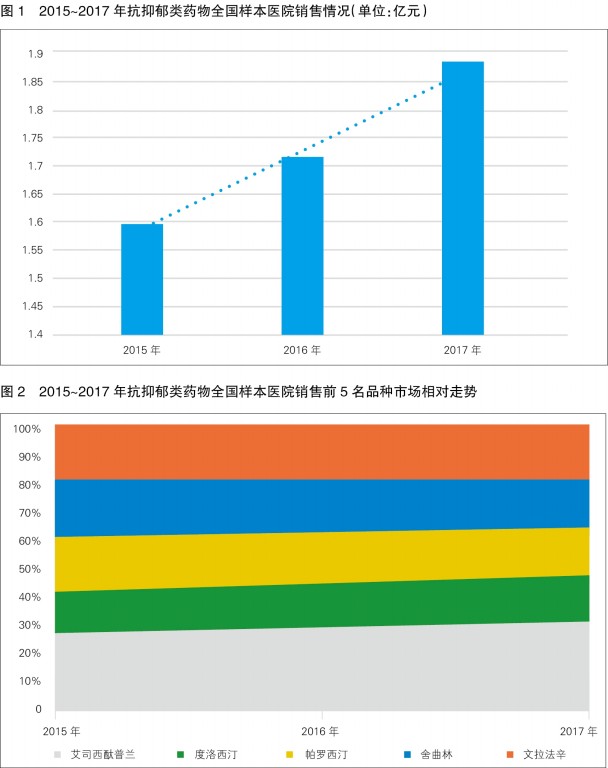 從2015~2017年抗抑郁類藥物全國樣本醫(yī)院銷售情況可以看出,我國抗抑郁藥物的使用量逐年遞增(見圖1)。2015~2017年,我國抗抑郁類藥物的市場銷售復(fù)合增長率為5.6%,2016年同比增長7.3%,2017年同比增長9.8%。2017年,我國抗抑郁類藥物的市場銷售額約為95億元,未來仍將保持平穩(wěn)增長。
