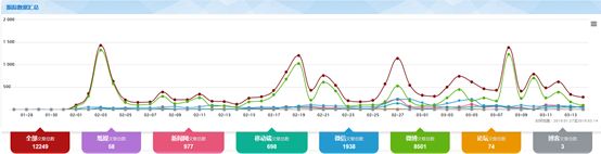 以1月27日~3月14日17時(shí)為監(jiān)測時(shí)間段,如上圖所示,輿情走勢呈“波浪式”發(fā)展特征,網(wǎng)民關(guān)注度遠(yuǎn)高于媒體關(guān)注度。