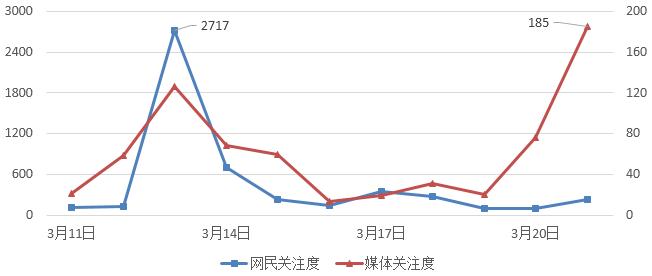 以3月11日-3月21日為監(jiān)測(cè)時(shí)間段,如圖1所示,相關(guān)輿情整體呈“波浪式”發(fā)展特征。網(wǎng)民關(guān)注度遠(yuǎn)高于媒體關(guān)注度。