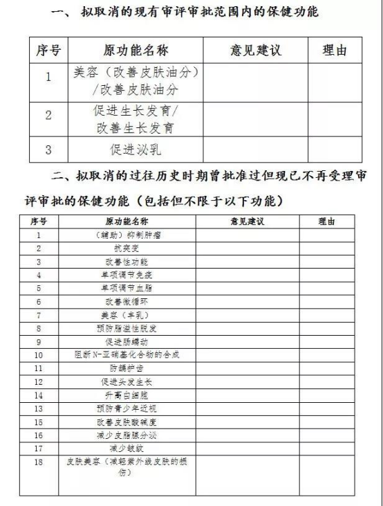 二、擬取消的保健功能。專(zhuān)家論證認(rèn)為,部分現(xiàn)有保健功能聲稱(chēng)與現(xiàn)行的保健食品監(jiān)管定位和健康需求不契合,特別是針對(duì)少年兒童、孕婦、乳母等特殊人群的保健功能應(yīng)當(dāng)實(shí)行更為嚴(yán)格的監(jiān)督管理,該部分保健功能應(yīng)予取消。同時(shí),應(yīng)當(dāng)取消過(guò)往歷史時(shí)期曾批準(zhǔn)過(guò)但現(xiàn)已不再受理審評(píng)審批的保健功能(詳見(jiàn)附件2)。自發(fā)布取消上述保健功能之日起,相關(guān)產(chǎn)品應(yīng)當(dāng)立即停止生產(chǎn),已生產(chǎn)的保健食品,不涉及質(zhì)量安全的,可銷(xiāo)售至保質(zhì)期結(jié)束;國(guó)家市場(chǎng)監(jiān)管總局不再受理、審評(píng)審批上述保健功能。