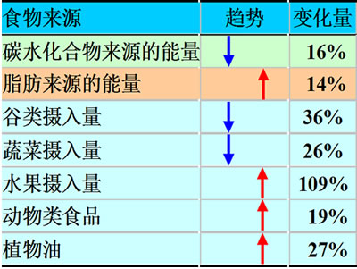 衛(wèi)生條件的改善和個(gè)人衛(wèi)生習(xí)慣的良性轉(zhuǎn)變,以及定期的婦科體檢是女性宮頸癌下降的主要原因。隨著居民營(yíng)養(yǎng)狀況的較大改善,膳食模式改變成為導(dǎo)致一些腫瘤發(fā)病率迅速上升的原因。舉例來(lái)說(shuō),1985年與2000年相比,天津市年人均谷物攝入量下降了53.8千克,蔬菜攝入量減少了45.8千克,而動(dòng)物類(lèi)食品增加了3.7千克,植物油消耗增加了1.7千克。結(jié)果導(dǎo)致碳水化合物來(lái)源的能量由69%下降到53%,脂肪來(lái)源的能量由19%增加到33%。