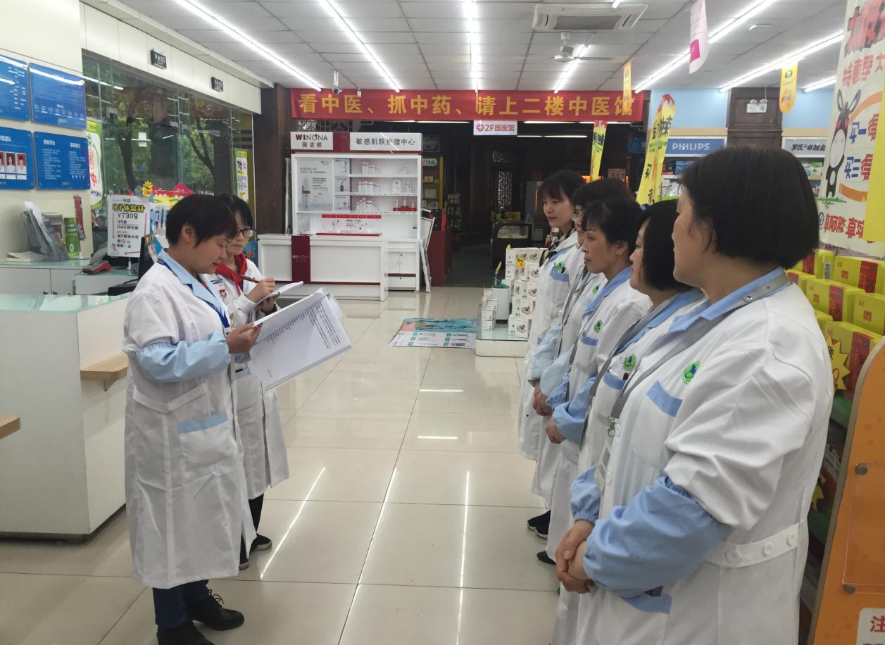 李小玉(左一)正在給店員講解藥品質量管理制度。杜然浩 攝