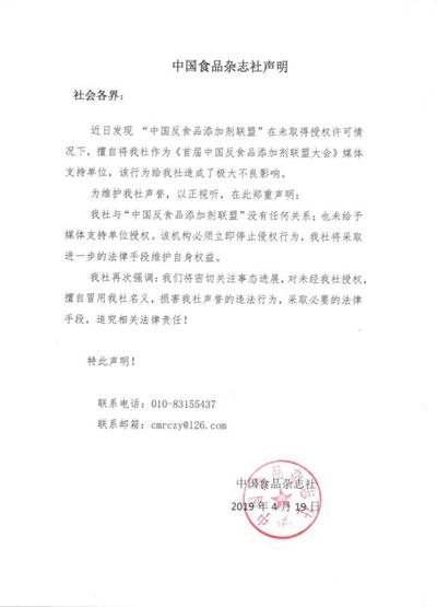 然而,就在4月19日,中國食品雜志社發(fā)布了一則聲明,表示“中國反食品添加劑聯(lián)盟”在未取得授權許可情況下,擅自將其作為這次活動的媒體支持單位,給雜志社造成了極大的不良影響,并澄清與“中國反食品添加劑聯(lián)盟”沒有任何關系,也未給予媒體支持單位授權。