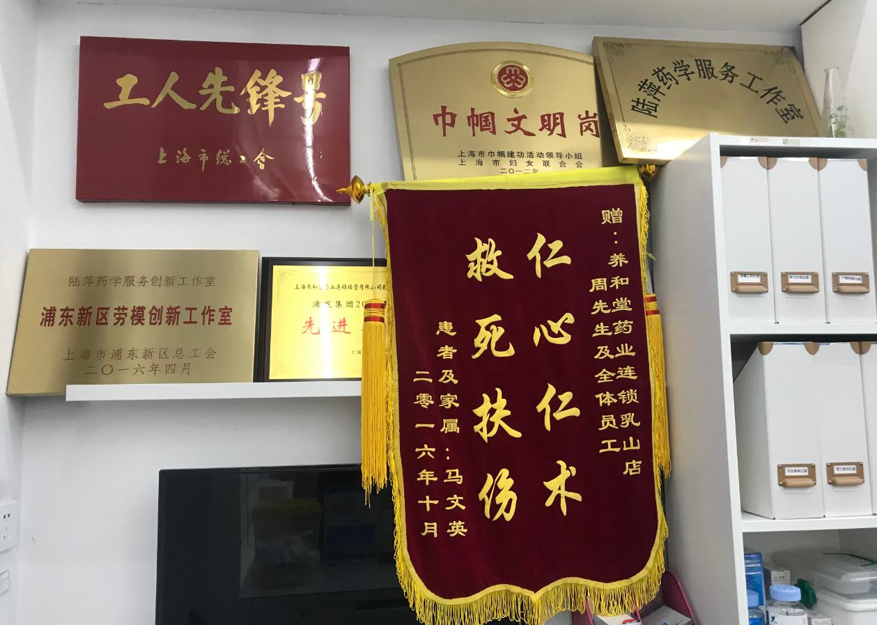 陸萍既是上海養(yǎng)和堂藥業(yè)連鎖經(jīng)營有限公司乳山店的質(zhì)量負(fù)責(zé)人,也是這里的首席執(zhí)業(yè)藥師。在門店一角“陸萍藥學(xué)服務(wù)工作室”的柜子上滿滿的牌匾——“工人先鋒號”“巾幗文明崗”“浦東新區(qū)勞模創(chuàng)新工作室”……