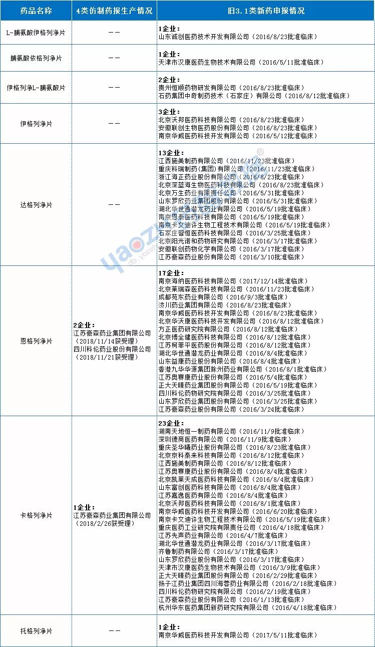 此外,稍后上市的那格列汀、曲格列汀、替格列汀3個(gè)品種也有企業(yè)進(jìn)行了申報(bào),其中于2015年上市的曲格列汀竟有29家企業(yè)進(jìn)行了舊3.1類新藥申報(bào),且申報(bào)時(shí)間基本集中在2015年,獲批臨床集中在2016年,其中不乏正大天晴、海正、石藥、齊魯?shù)葘?shí)力較強(qiáng)的企業(yè)。